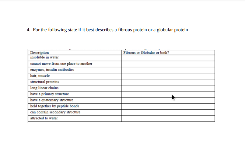 A are very stable and insoluble in water B rarely exhibit secondary structureC are usually called enzymesD are cellular catalysts Answer. 84 Choose the answer that best describes fibrous proteins. C Tyrosine is a modified amino acid.